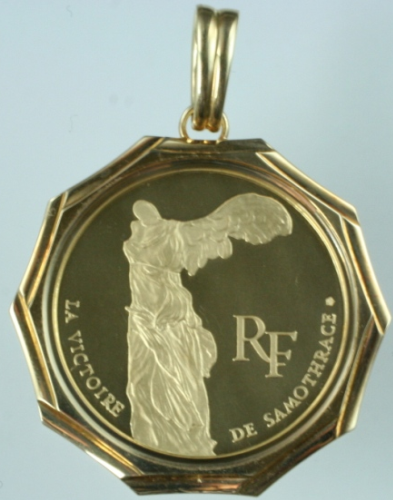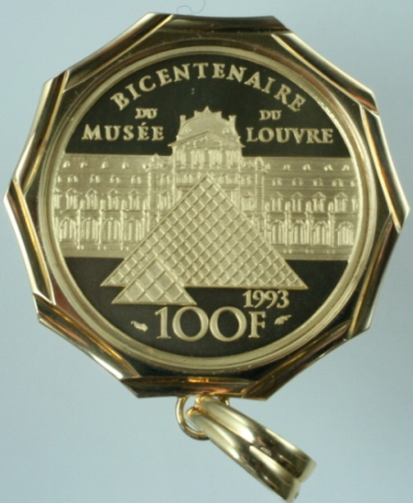 [100フラン金貨。写真は18Kガラス枠付。17gで5,000枚の発行。]