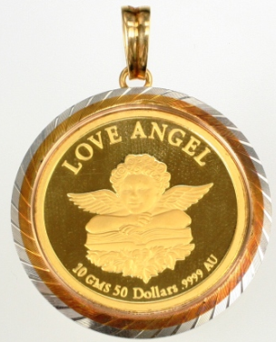 [写真はK18 ガラス枠付。50ドル金貨。直径27mmで10g。250枚の発行]