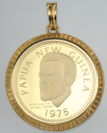 [写真はK18 ガラス枠付。100キナ金貨。9,57gで18,000枚の発行]