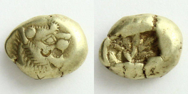クロイソスの時代には金銀を分離する方法が確立され(*塩と一緒に800℃程まで熱し、純度の高い金を採り出したと考えられている)、その重量に対する交換比率も定めたとみられます。