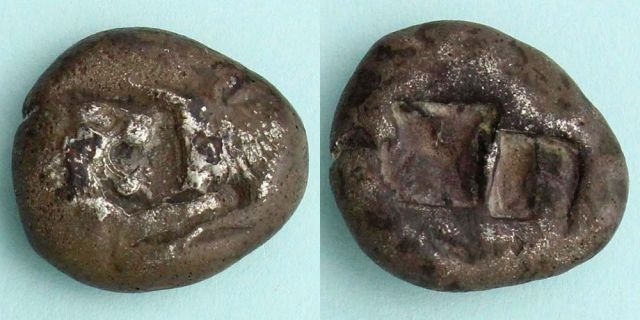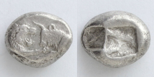 当時はまだ銅貨は造られず、最も小さい貨幣は1/12スターテル銀貨(約0.9g)でした。それでもエレクトラム貨の時代よりは大きくなっており、使いやすさはわずかに向上しています。