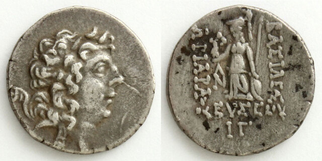 下部の「ΓΛ」銘は王の治世33年目(=紀元前130年)を示し、製造年の明記がカッパドキアのコインの特徴として継承されました。王の肖像は代が替わると変更されましたが、アテナ女神像はそのままだったことから、王家はアテナ女神を守護神として崇敬していたようです。
