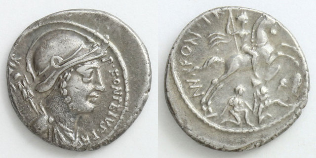 紀元前1世紀のローマで発行されたコインには、上の4ドラクマ貨とよく似た構図が表現されています。