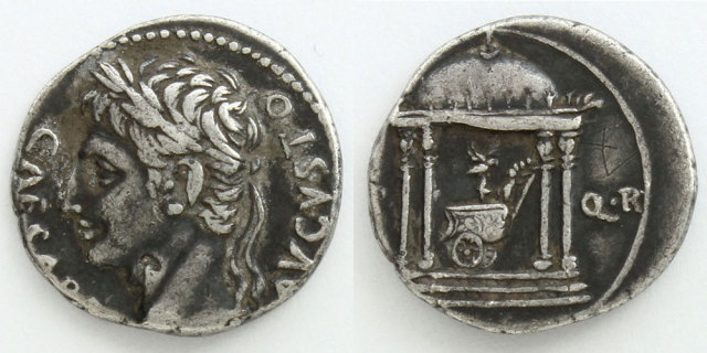 初代皇帝アウグストゥスの治世下に発行されたデナリウス銀貨。紀元前19年頃に造られたこのコインには、敵から奪った戦車が納められたマルス神殿が表現されています。アウグストゥスはユリウス・カエサルを暗殺したブルートゥスたちを打ち破った記念として、ローマ市内中心部のフォルム(広場)にマルス・ウルトル(復讐のマルス)神殿を建立しました。最終的な完成と奉納は紀元前2年5月12日とされることから、コインには計画段階の姿が表現されたとみられます。