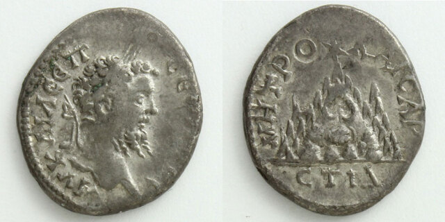 コインの場合はクラウディウス帝時代のローマでみられますが、他の皇帝のコインにはほとんど表現されていません。また、属州統治下の小アジアで僅かな例があるのみであり、比較的希少な存在です。