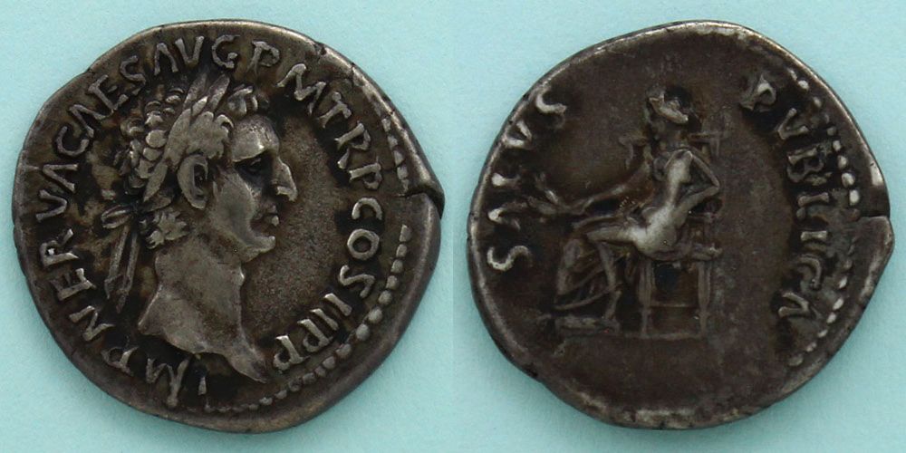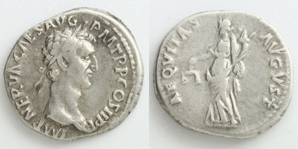 表面はネルヴァ帝(在位:AD96-AD98)、裏面にはアガトダイモンが表現されています。このコインは属州都市アレクサンドリアで造られた低品位銀貨であり、エジプト属州内で流通しました。