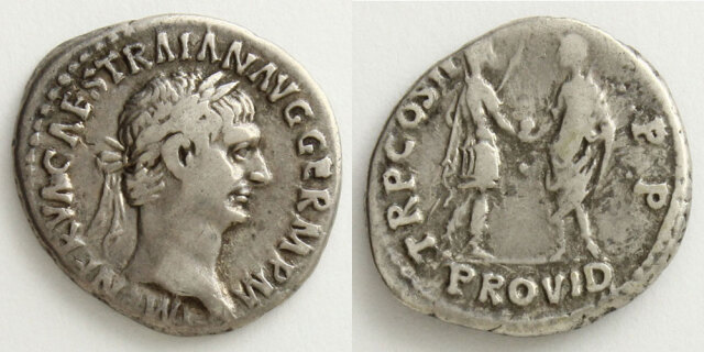 トラヤヌス帝は積極的な領土拡大策によってローマ帝国の版図を史上最大にしました。ダキア征服後の114年~116年頃に発行されたデナリウス銀貨には、戦勝トロフィーを担いで堂々と歩むマルス神の姿が表現されています。当時はパルティア遠征の最中であり、ローマの軍事的成功を祈念する意匠として採用されました。