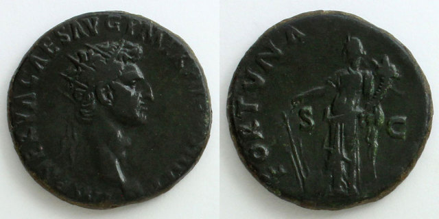 表面には皇太后アグリッピナと息子ネロ帝、裏面にはネメシスの立像が表現されています。同時代のローマ本国で発行された上のコインと全く同じ構図で表現されています。
